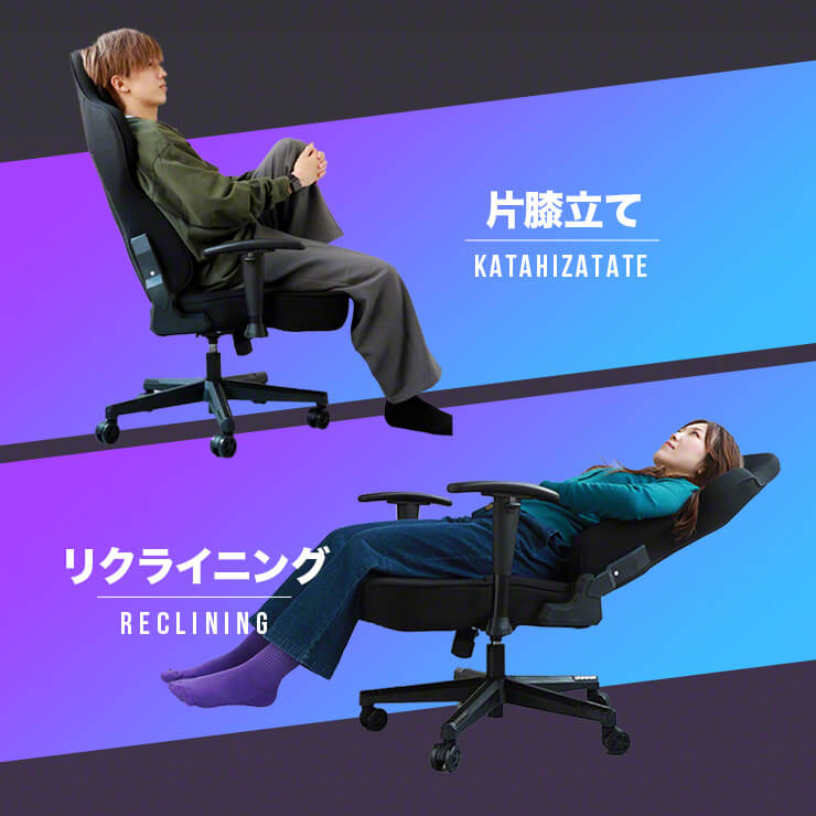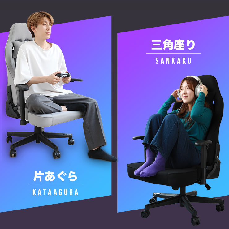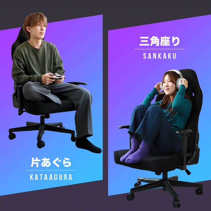あぐら座りで「もっと、集中」自由な姿勢で「ホッと、ひと息」、座り方思いのまま!きちんと座るのはなんだか落ち着かない、そんな「あぐラー」のために開発された、あぐらをかけるゲーミングチェア。素材にファブリック(布)を採用し、肌ざわり・通気性がアップ。長時間の作業もより快適になりました。