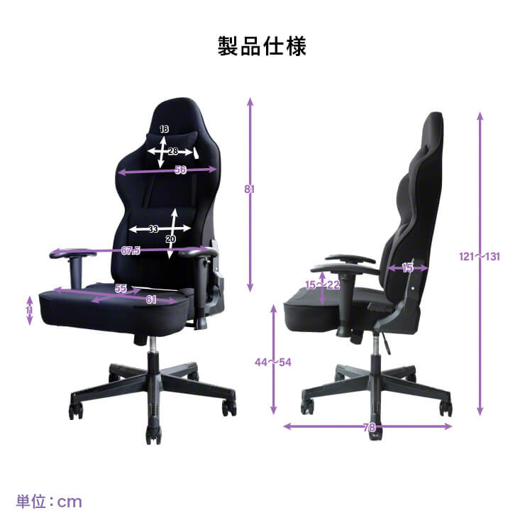 幅 67.5cm(67.5 ~ 77.5cm)×高さ 121cm(88 ~ 131cm)×奥行 78cm(78 ~ 126cm)/座面高さ:44cm(44 ~ 54cm)/角度:90 ~ 160°