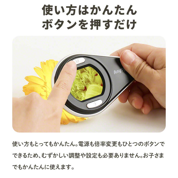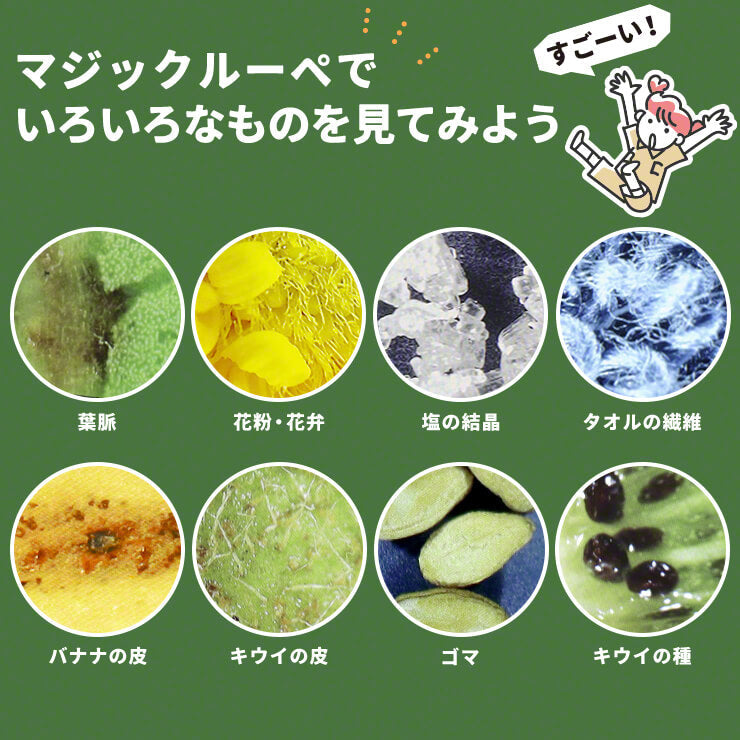 マジックルーペは、最大14倍の倍率で対象物を映し出すことができる、小型のデジタルルーペです。液晶ディスプレイに鮮やかな画像を表示できます。子供の手のひらに収まるほどのコンパクトサイズ。普段見ている植物や生き物も、マジックルーペで拡大してみると、新しい発見がいっぱいです。子供の好奇心を刺激し、自然や科学への興味を育むのに最適なアイテム「マジックルーペ」ぜひ、お子様と一緒に、小さな世界を大発見してみてください。