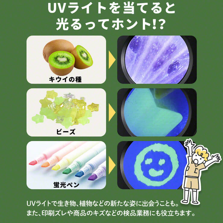 - LEDライトで暗い場所でも明るく観察 UVライトで光るものを観察