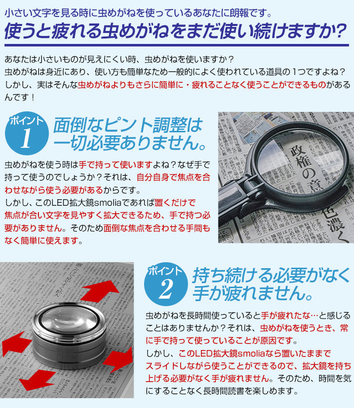 置くだけで文字を見やすく拡大 拡大率約3倍 新聞、読書も疲れることなく楽しめるます。LEDライトで明るくくっきり見えます。充電式で面倒な電池交換の手間もありません。持ち運びに便利な収納ケース付き