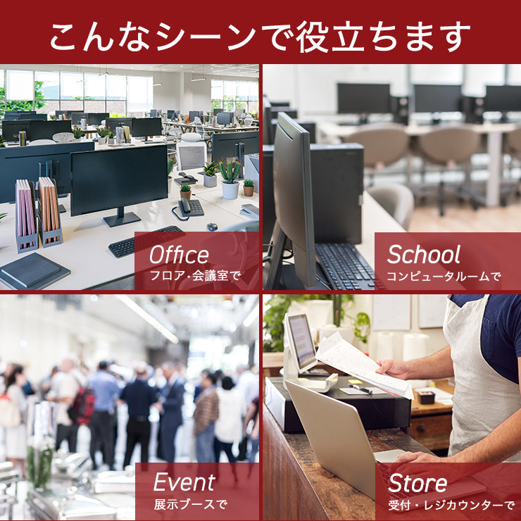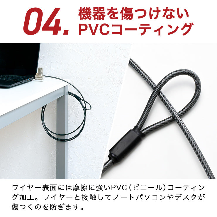 ワイヤーを机の脚や柱などに巻きつけ、セキュリティスロットに差し込んでロックすることで、ノートパソコンの持ち出しを防止します。