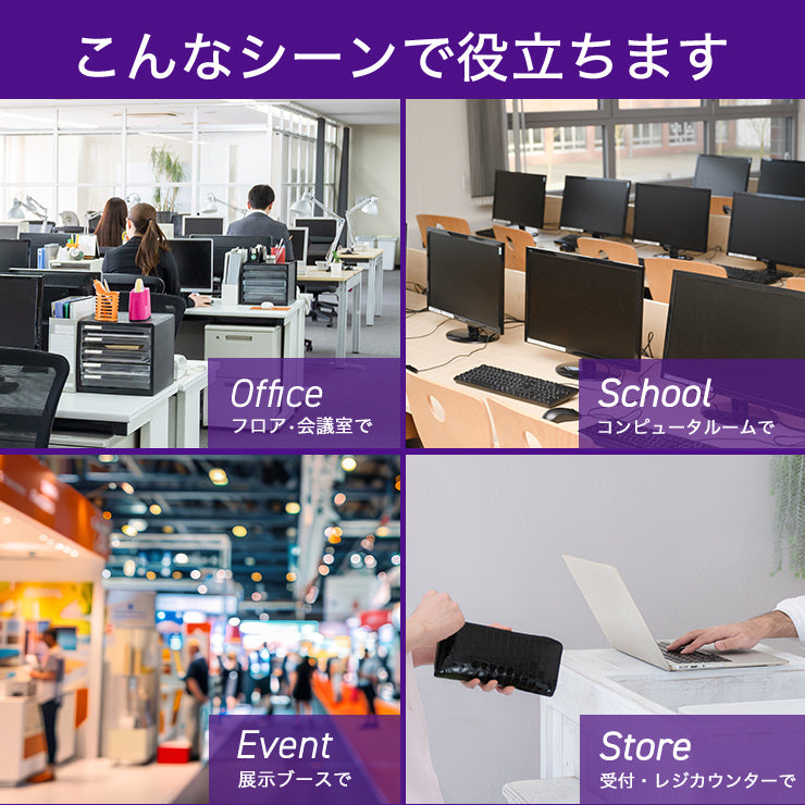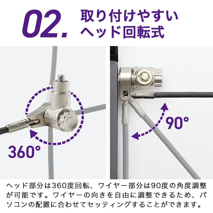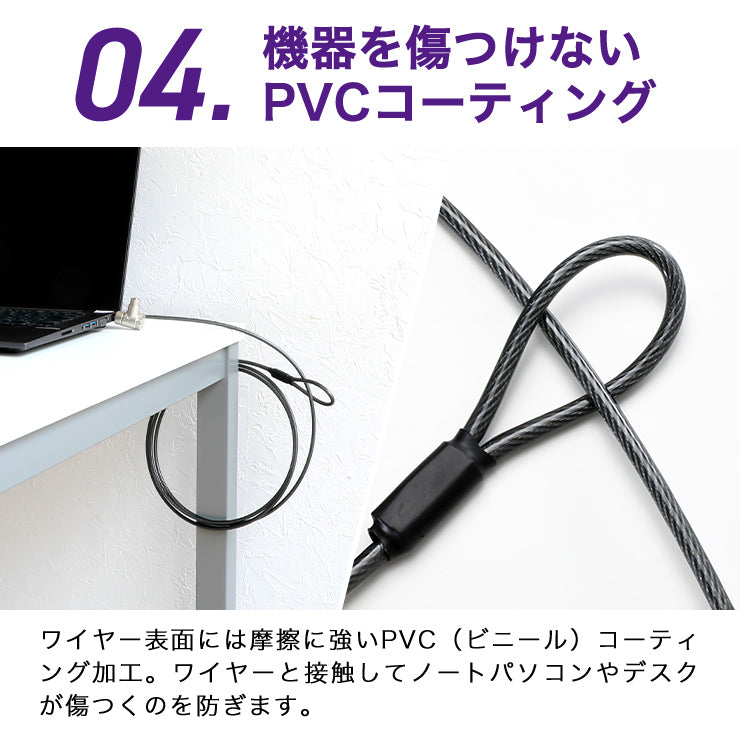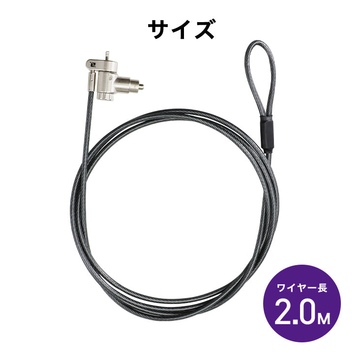 ワイヤーを机の脚や柱などに巻きつけ、セキュリティスロットに差し込んでロックすることで、ノートパソコンの持ち出しを防止します。鍵を回してロックするシリンダーロック式です。