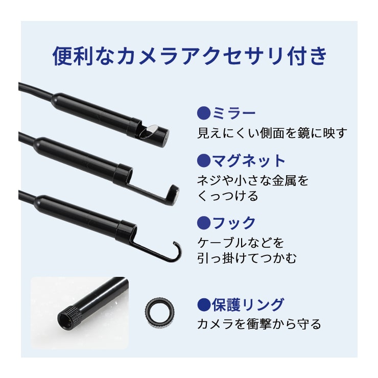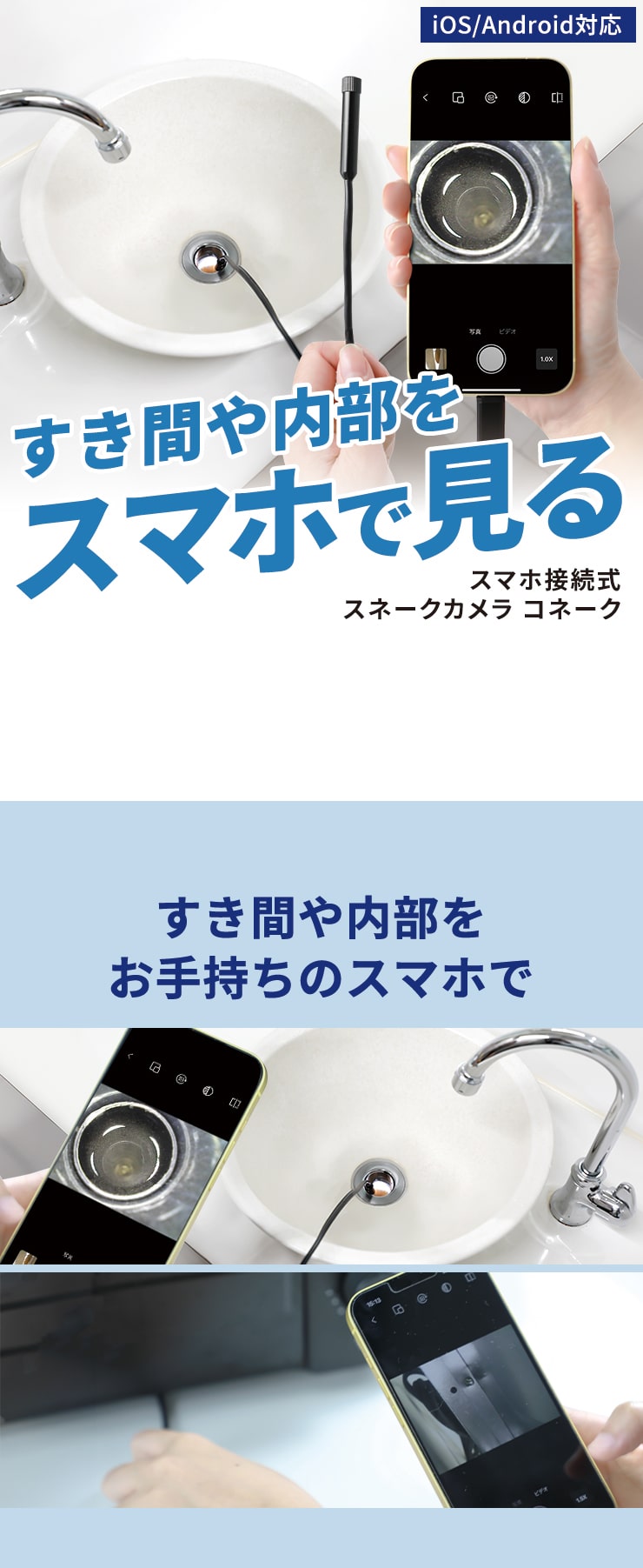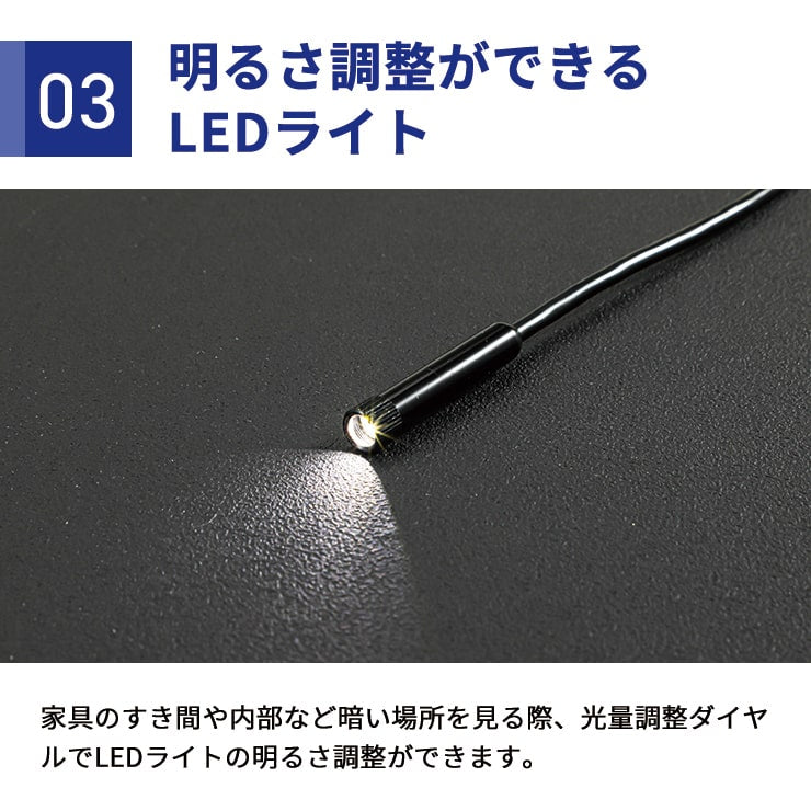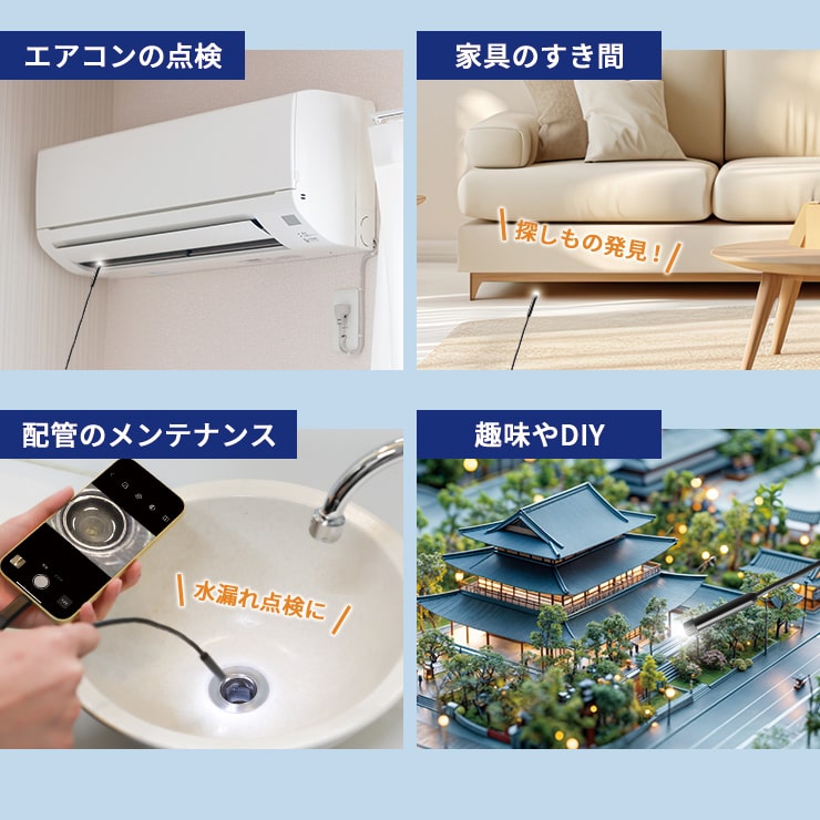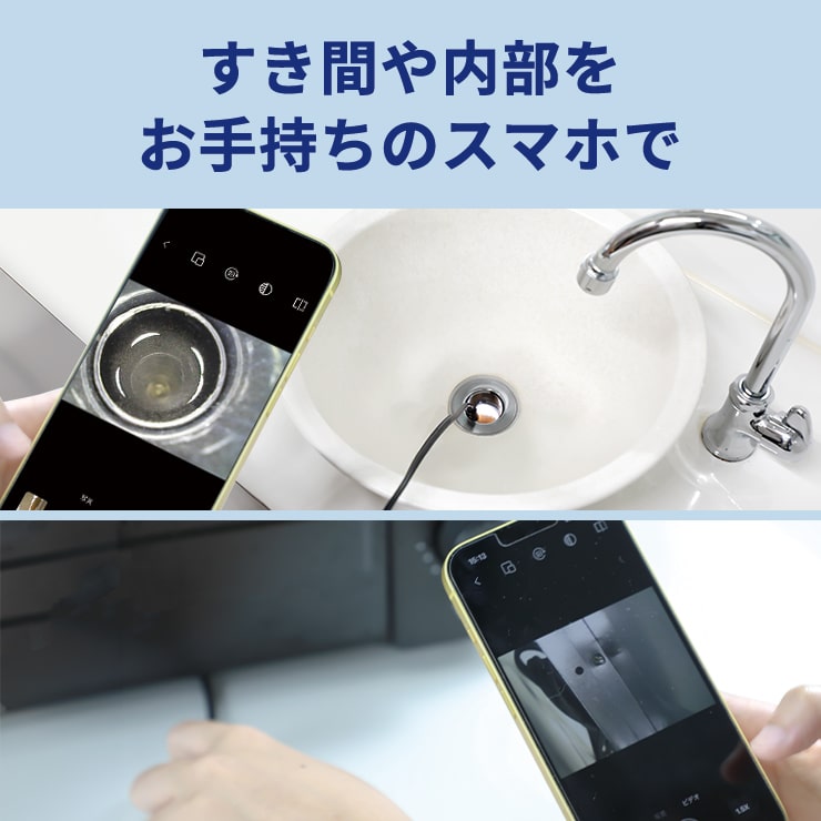 落とし物を探したりエアコンの点検、配管のメンテナンスに。LEDライトであたりを明るく照らしながらお手持ちのスマホで家具のすき間や内部を見ることができます。