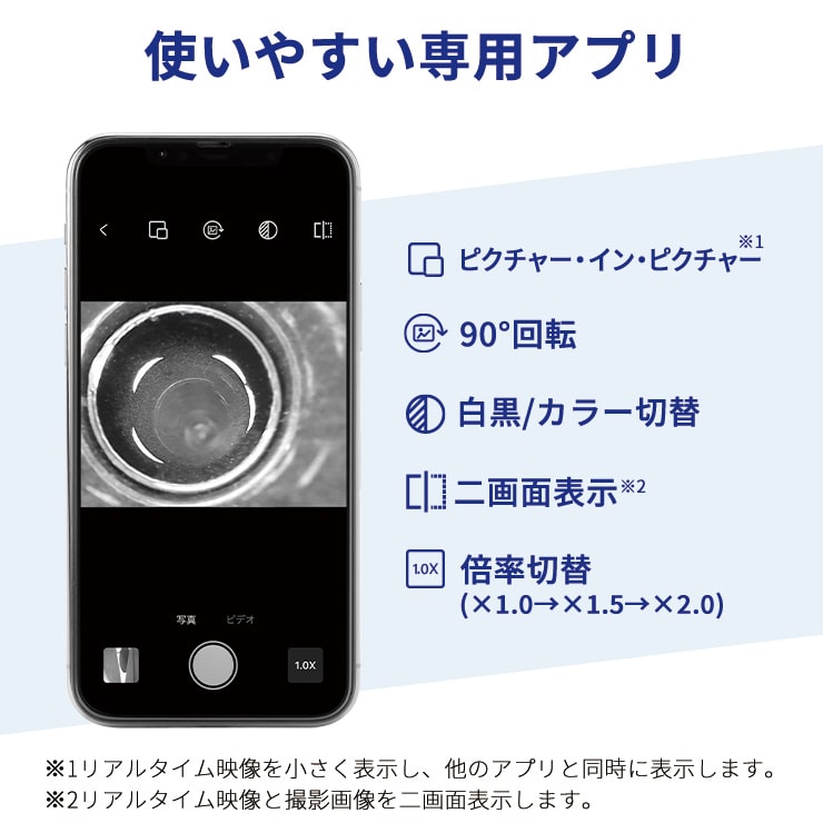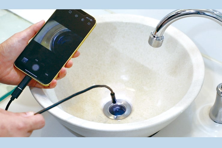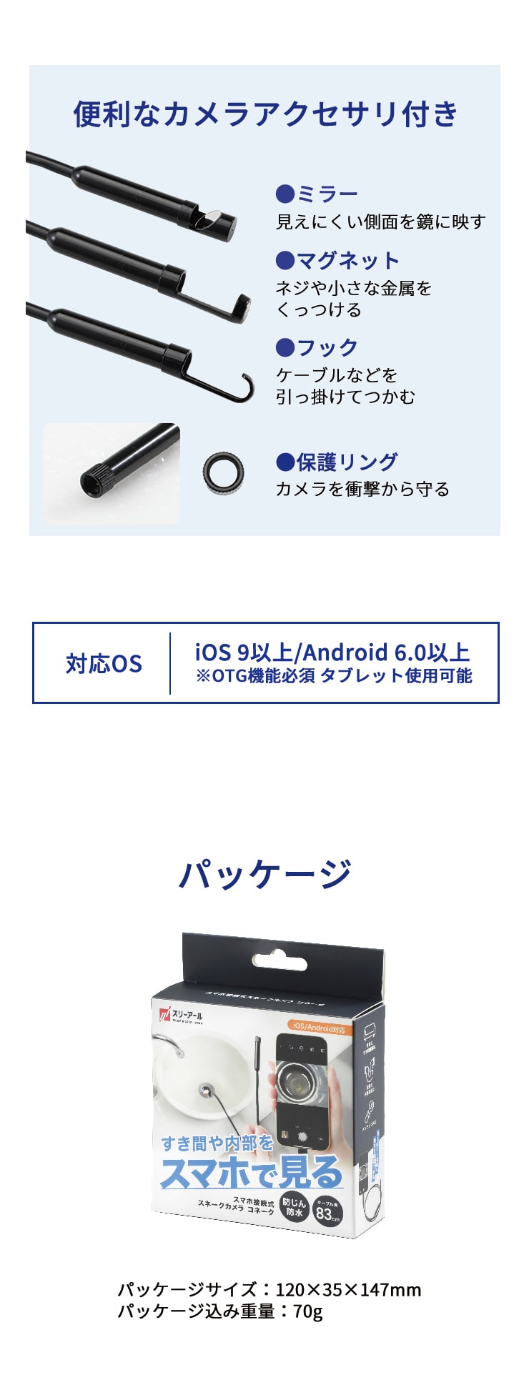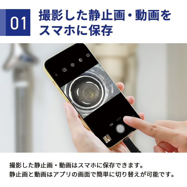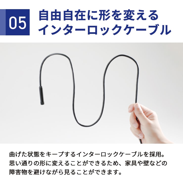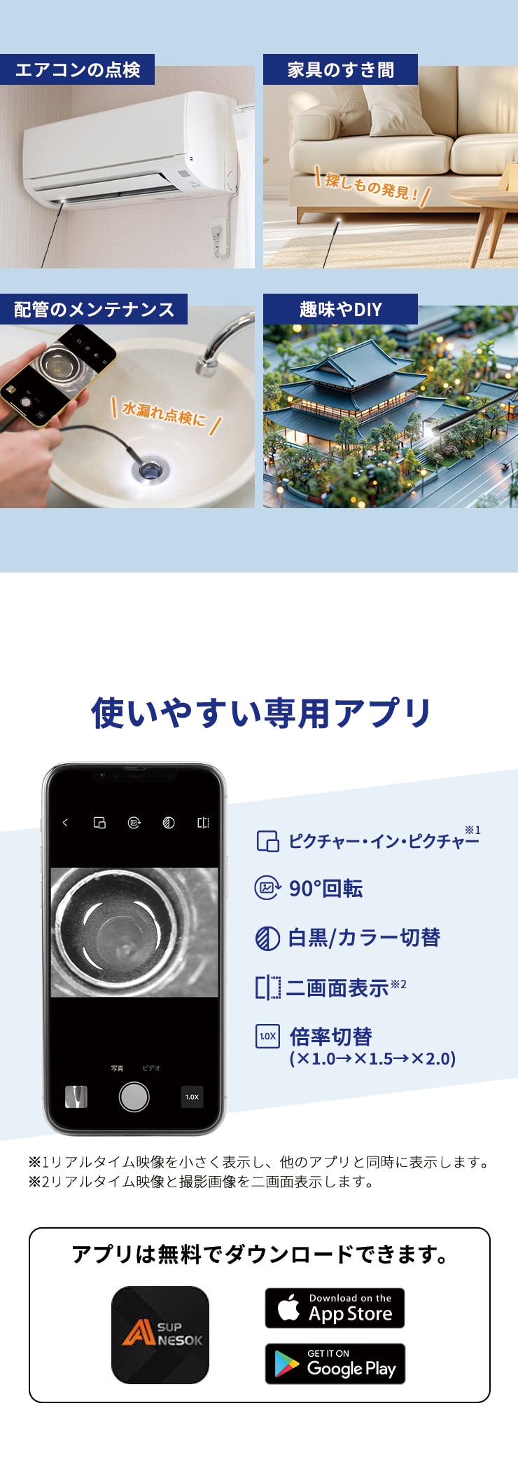落とし物を探したりエアコンの点検、配管のメンテナンスに。LEDライトであたりを明るく照らしながらお手持ちのスマホで家具のすき間や内部を見ることができます。